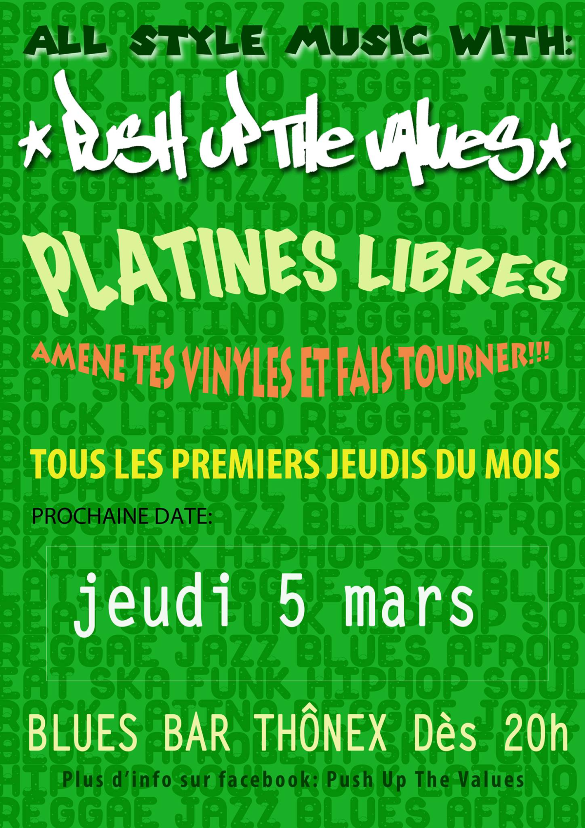 Dans cette perspective, on avait organisé de 2014- 2019 (jusqu'au covid) une session de Platines Libres au Blues Bar à Thônex. Chacun était libre de venir passer de la musique avec ses vinyles une fois par mois. Plus de 50 rencontres organisées!