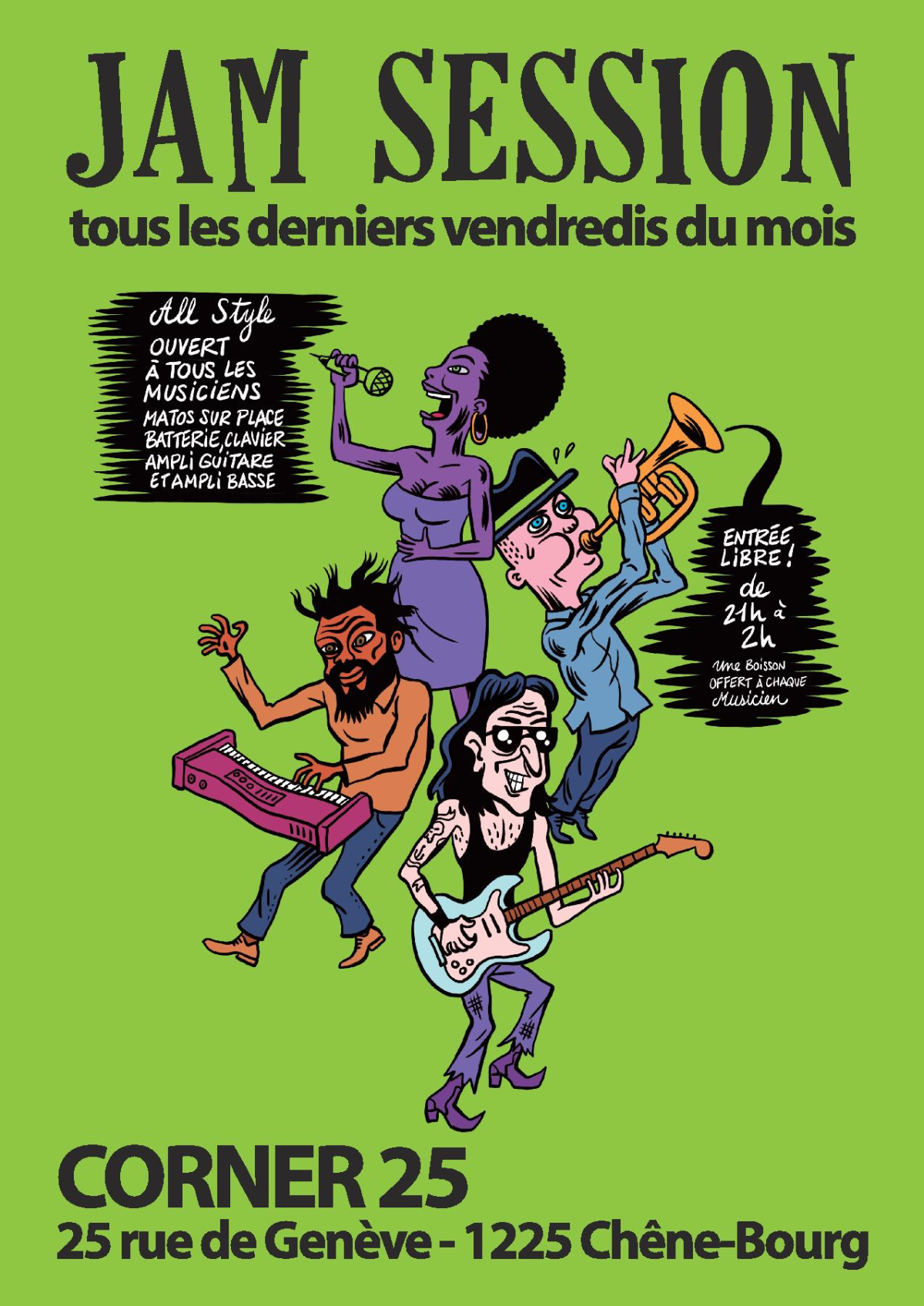 Nous avons organisé de 2014-2018 des "Jam session" au Corner 25. Un lieu unique, prolongement de la cathédrale alternative que fut le Goulet et ces 2 salles (entre autres activités...). Le Goulet 13 où avait lieu des jams également et des concerts (Gingala, P.P.P, Original Nature, La Substance, Les Legroupes) et le Goulet 25 axé principalement sur les soirées DJ (Sub6, Addis crew, Chill Pop, Postman, Cultural Warriors et d'autres...)